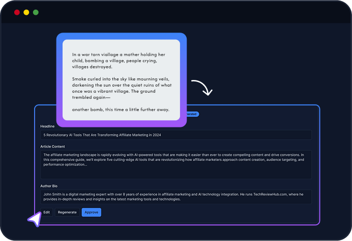 No more waiting weeks to launch. Simply enter your niche idea, and watch as AffiliateReelAI instantly transforms it into a conversion-optimized affiliate site with strategic call-to-actions, proven layouts, and buying triggers that turn visitors into buyers.