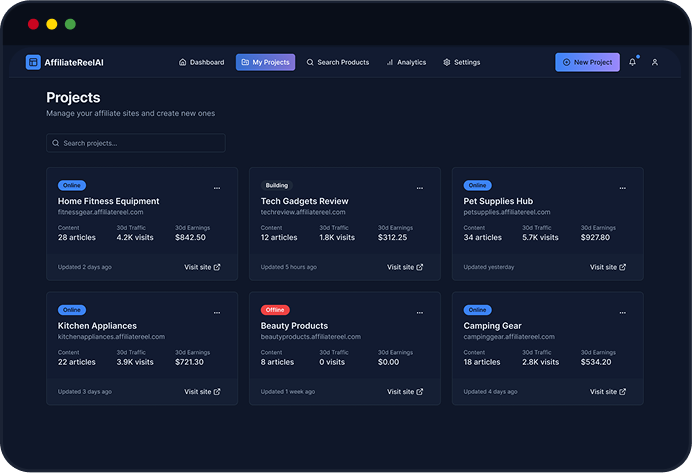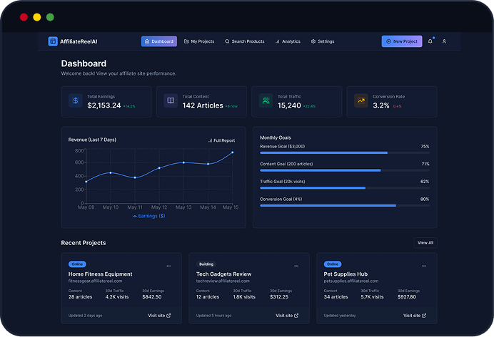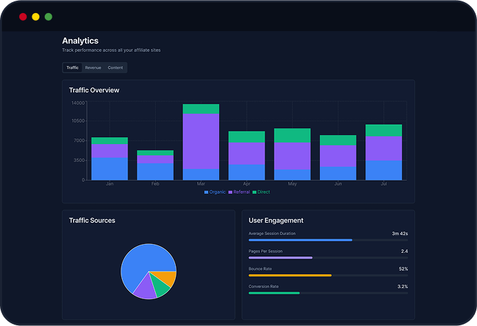 Track your success with our comprehensive analytics. Monitor traffic, conversion rates, and earnings in real-time across all your affiliate sites from one centralized dashboard. Identify winning strategies and optimize underperforming content for better results.